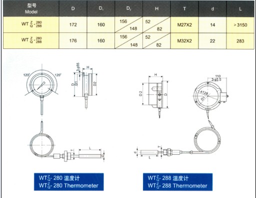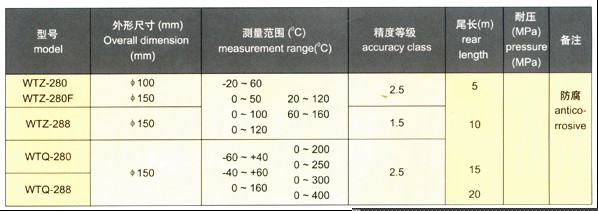 WTZ/WTQ-280/288系列壓力式溫度計(jì)該型號(hào)壓力式溫度計(jì)適用于過程中較遠(yuǎn)距離的非腐蝕性液體或氣體的測(cè)量,電接點(diǎn)型壓力式溫度計(jì)能在工作溫度達(dá)到和超過給定值時(shí)發(fā)出電訊號(hào)。