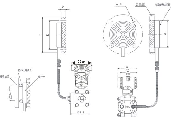 AK-3051GP遠傳壓力變送器是一種通過安裝在管道或容器上的遠傳裝置來感受被測壓力,該壓力經毛細管內的灌充硅油(或其它的液體)傳遞至變送器的主體,然后由變送器主體內的δ室和放大線路板,將壓力或差壓轉換4~20mA.DC信號輸出(參見結構原理圖)。