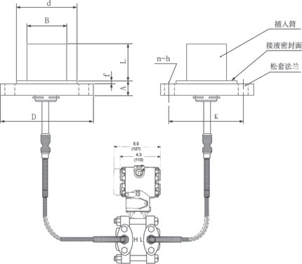 AK-3051DP雙法蘭液位變送器是一種通過安裝在管道或容器上的遠傳裝置來感受被測壓力,該壓力經毛細管內的灌充硅油(或其它的液體)傳遞至變送器的主體,然后由變送器主體內的δ室和放大線路板,將壓力或差壓轉換4~20mA.DC信號輸出(參見結構原理圖)。 |