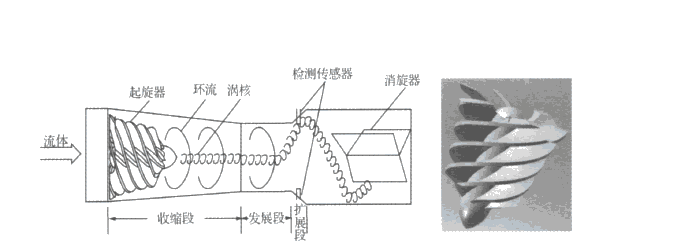 在流量計(jì)入口處裝有螺旋形導(dǎo)流葉片,流體進(jìn)入后會(huì)產(chǎn)生激烈的螺旋旋轉(zhuǎn),進(jìn)入擴(kuò)散腔后流體會(huì)發(fā)生二次旋轉(zhuǎn),氣體旋轉(zhuǎn)后撞擊流量計(jì)內(nèi)壁產(chǎn)生振動(dòng)頻率,振動(dòng)頻率是和流量成正比的。當(dāng)流量計(jì)設(shè)計(jì)得當(dāng)時(shí),在很寬的流量范圍內(nèi),旋渦的頻率與流量成線性關(guān)系,該頻率由壓電傳感器檢測(cè),由流量積算儀進(jìn)行運(yùn)算和處理,可以輸出4~20mA信號(hào)。